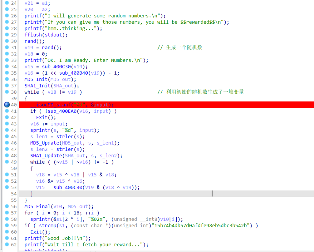 逻辑还好,先是利用一个随机数生成了一堆变量,然后输入并检测,如果输入的所有数字都对的话就会自己吐出来flag(将s进行SHA加密)