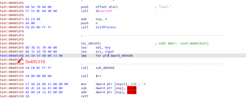 jmp far 这个大跳被ida识别错了,应该是调到0x405310的位置然后将运行的系统改为64位的,然后下面的将 0x23 压入栈中,然后 retf 返回的时候将系统又改回32位的,并通过返回的值进行判断 flag