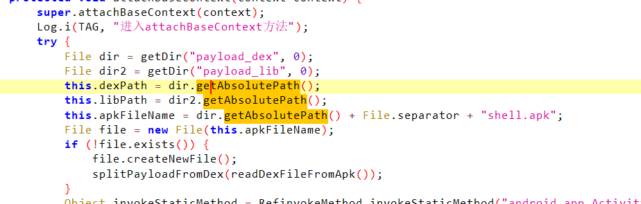 apk开始运行时会检测有无 shell.apk 解包后发现是没有的,进入 if 语句,创建 shell.apk 并将动态的dex和lib文件存储在新创建的两个文件夹中