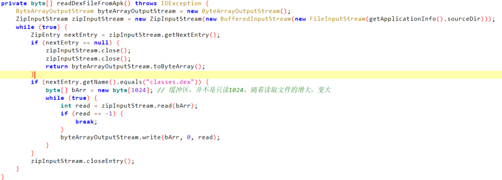 readDexFileFromApk() 方法将apk目录下的 classes.dex文件全读了进来