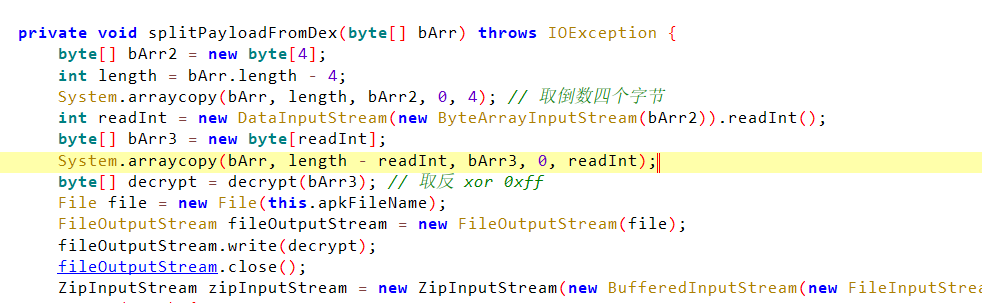 取倒数四个字节为长度,然后以这个长度读取末尾的数据取反后,写入 shell.apk
