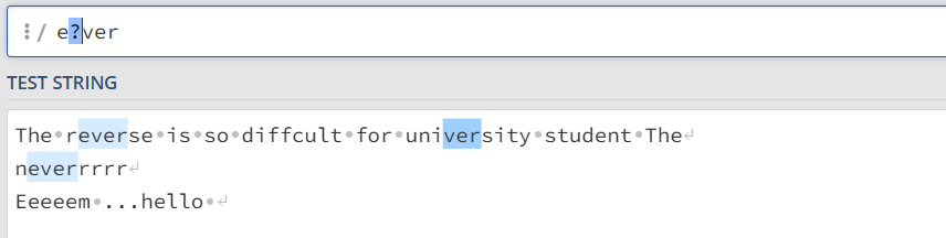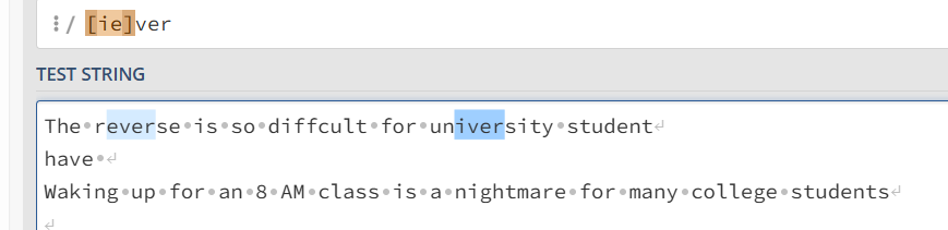 用于匹配字符集中的任意一个字符 [ie]ver 可以匹配 ever 和 iver,其他的就不能匹配了
